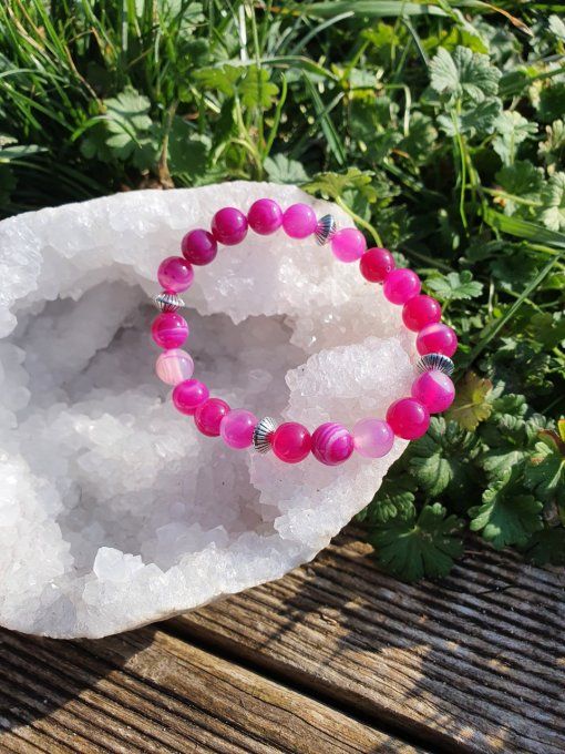 Bracelet Agate Rose L'agate rose est une pierre d'apaisement des émotions. Elle apporte un sentiment de sécurité de réconfort . Elle aide à réduire le stress